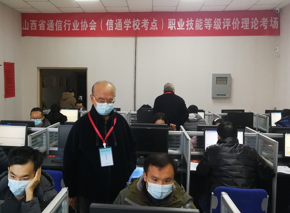 图为原山西省通信管理局局长、上届山西省通信行业协会理事长、现山西省通信行业协会刘永斌高级顾问巡视职业技能等级评价理论考试考场。